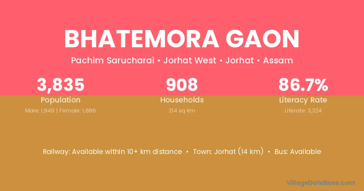 Bhatemora Gaon village has a total population of 3,835 people, of which 1,949 are males and 1,886 are females.