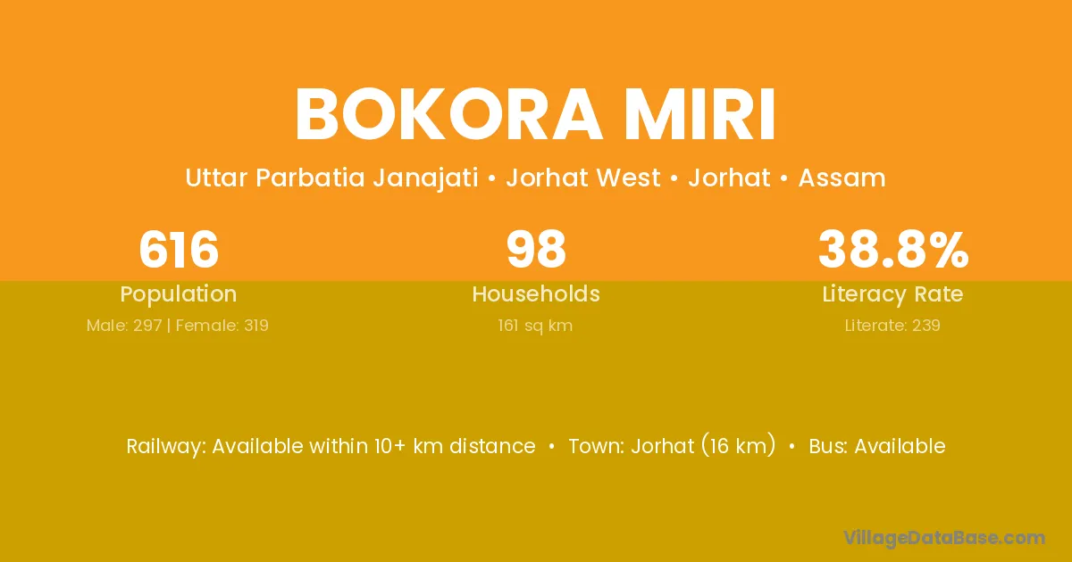 Jorhat (16 km) is the nearest town to Bokora Miri village for major economic activities and is located approximately 16 km away.