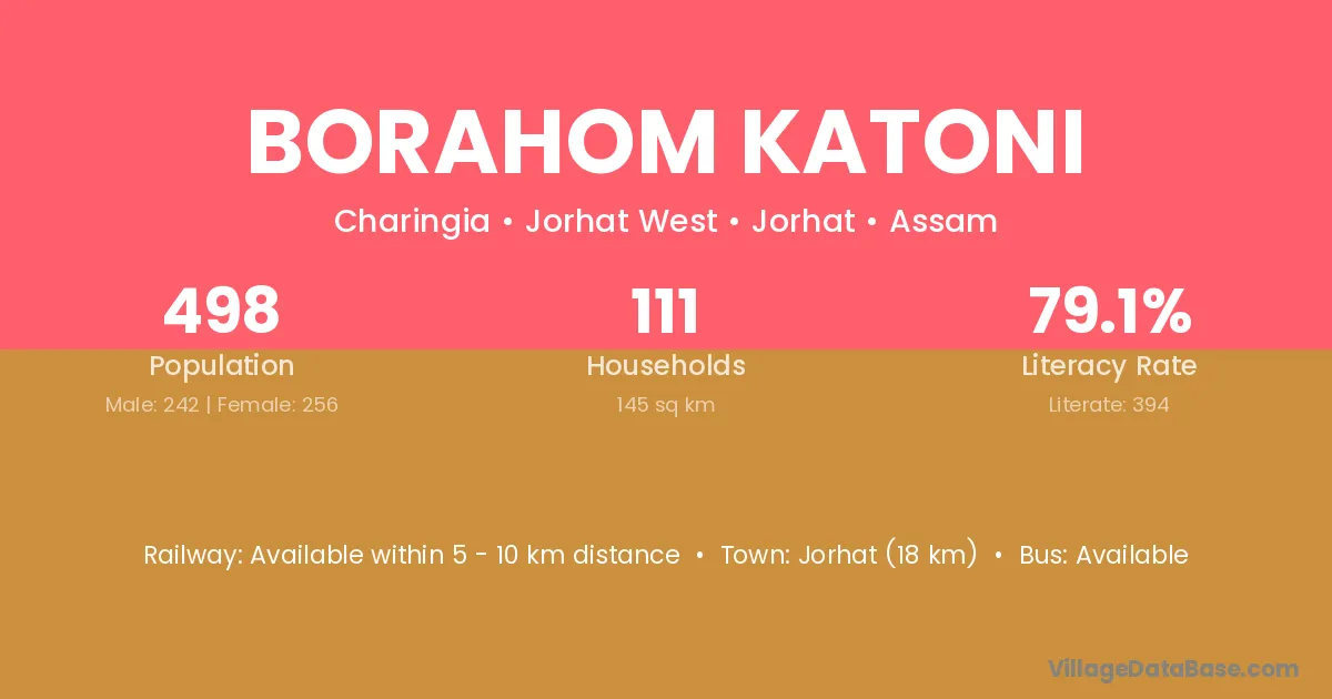 Borahom Katoni village has a total population of 498 people, of which 242 are males and 256 are females.
