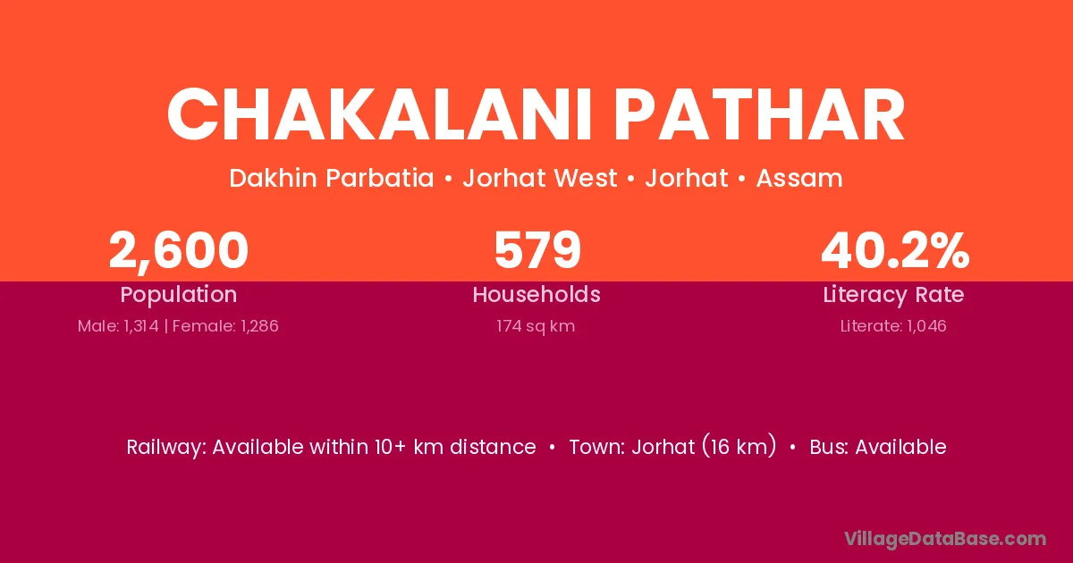 Jorhat (16 km) is the nearest town to Chakalani Pathar village for major economic activities and is located approximately 16 km away.
