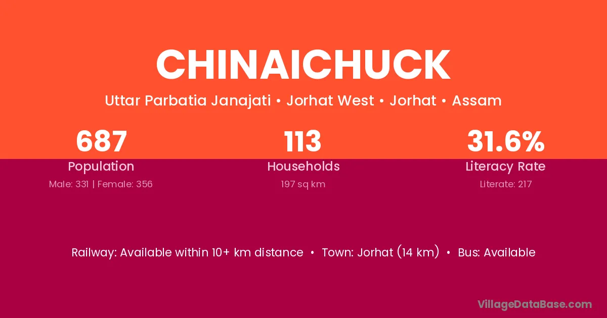 Jorhat (14 km) is the nearest town to Chinaichuck village for major economic activities and is located approximately 14 km away.