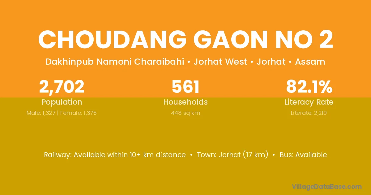 Jorhat (17 km) is the nearest town to Choudang Gaon No 2 village for major economic activities and is located approximately 17 km away.