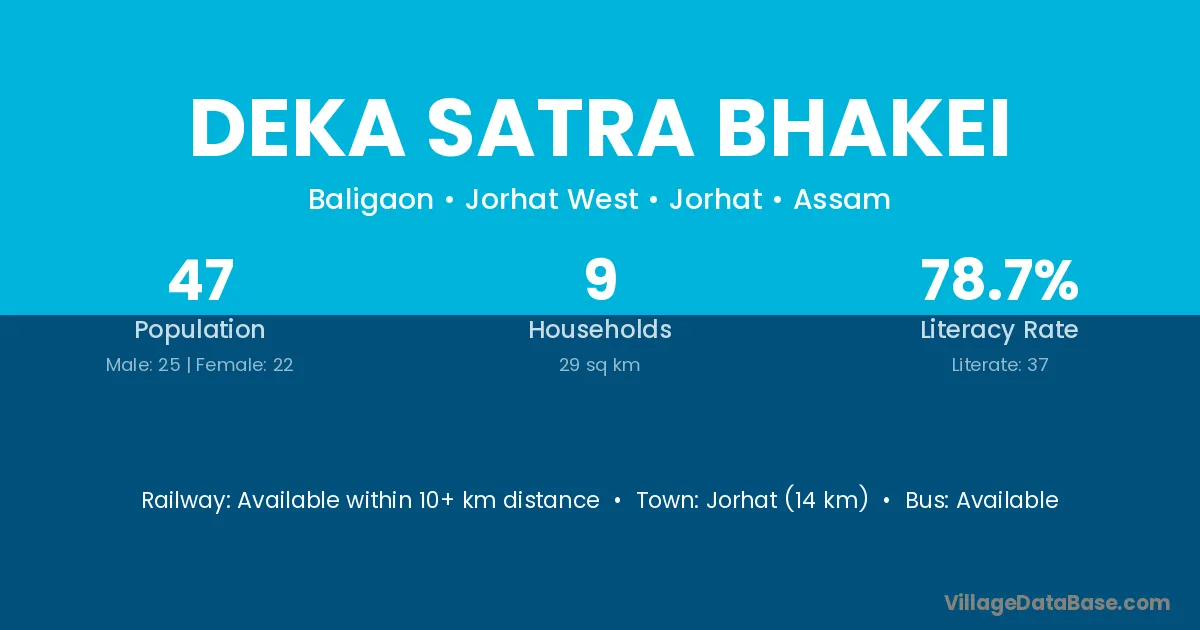 Deka Satra Bhakei village has a total population of 47 people, of which 25 are males and 22 are females.