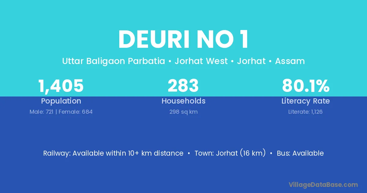 Jorhat (16 km) is the nearest town to Deuri No 1 village for major economic activities and is located approximately 16 km away.