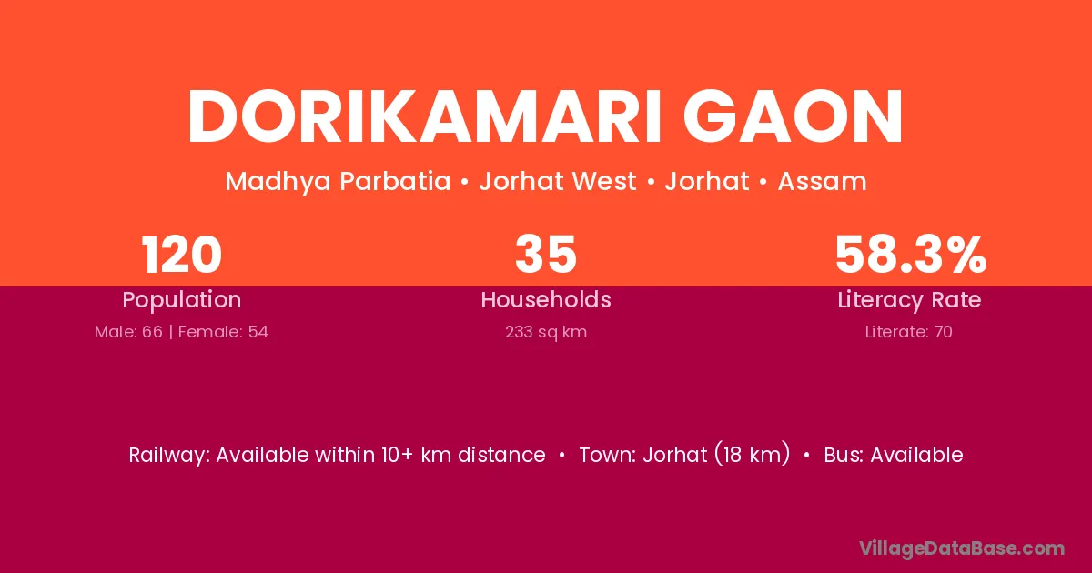 Jorhat (18 km) is the nearest town to Dorikamari Gaon village for major economic activities and is located approximately 18 km away.
