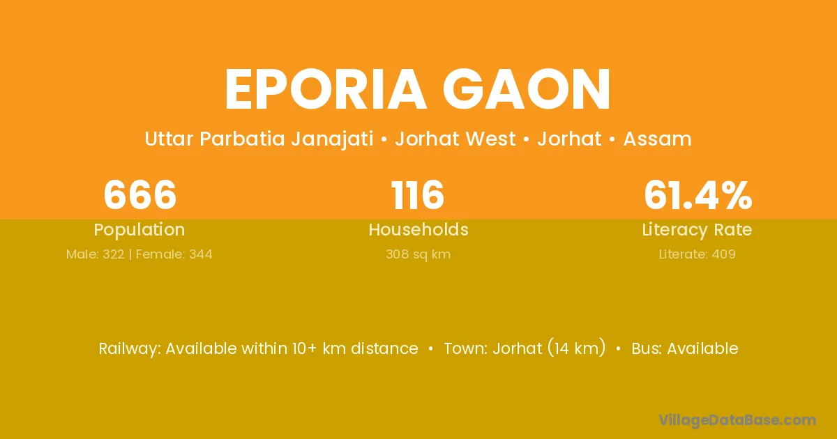 Jorhat (14 km) is the nearest town to Eporia Gaon village for major economic activities and is located approximately 14 km away.