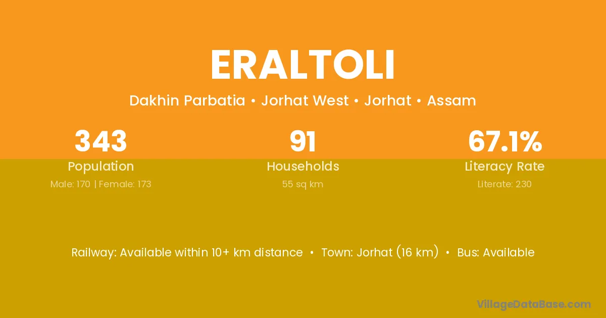 Jorhat (16 km) is the nearest town to Eraltoli village for major economic activities and is located approximately 16 km away.