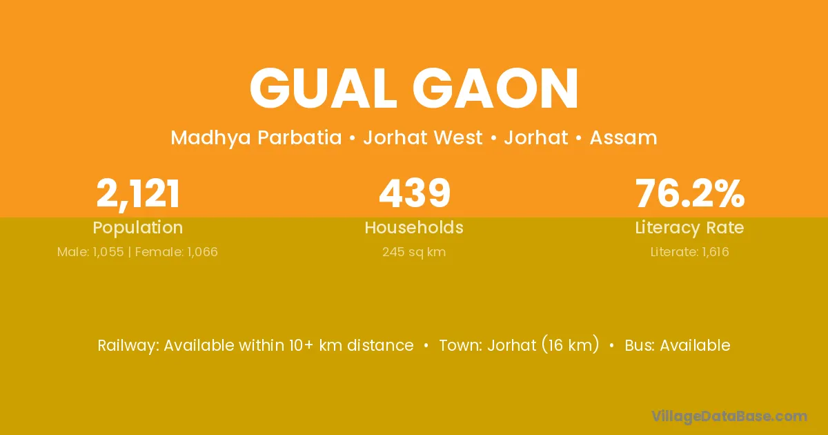 Jorhat (16 km) is the nearest town to Gual Gaon village for major economic activities and is located approximately 16 km away.
