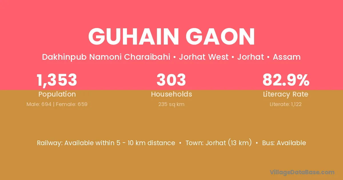 Jorhat (13 km) is the nearest town to Guhain Gaon village for major economic activities and is located approximately 13 km away.