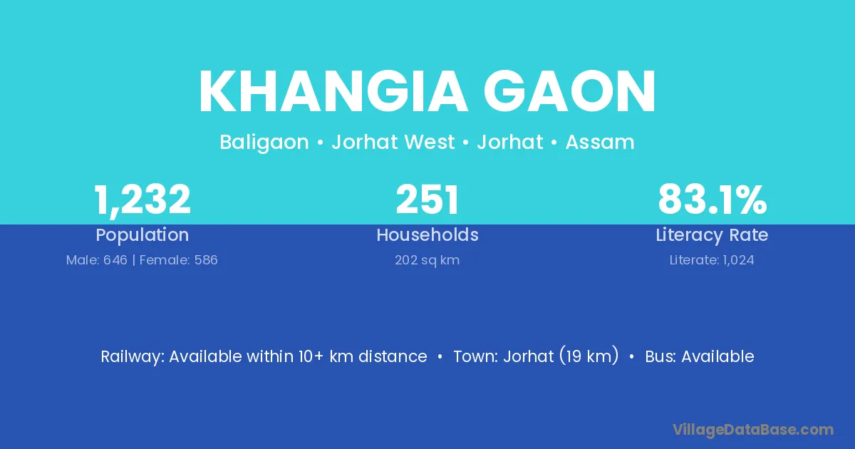 Jorhat (19 km) is the nearest town to Khangia Gaon village for major economic activities and is located approximately 19 km away.