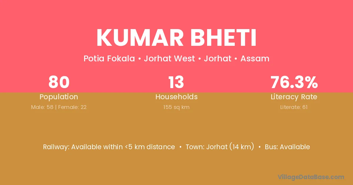 Jorhat (14 km) is the nearest town to Kumar Bheti village for major economic activities and is located approximately 14 km away.