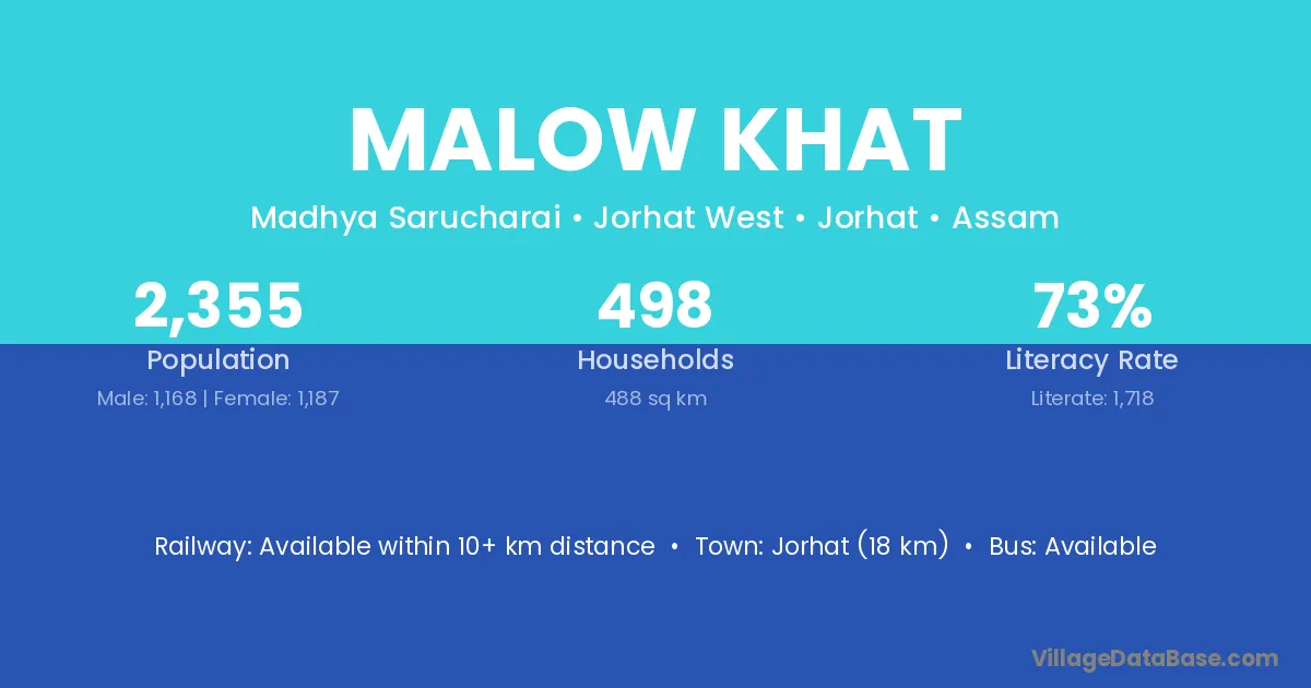Jorhat (18 km) is the nearest town to Malow Khat village for major economic activities and is located approximately 18 km away.