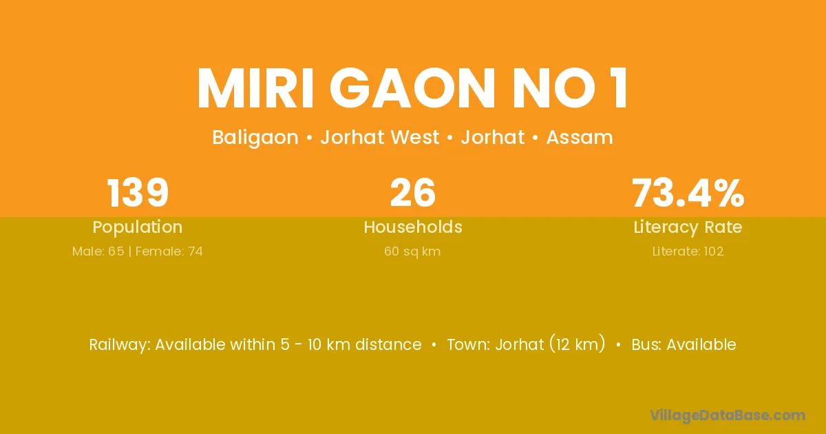 Miri Gaon No 1 village has a total population of 139 people, of which 65 are males and 74 are females.
