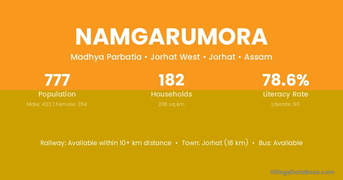 Jorhat (18 km) is the nearest town to Namgarumora village for major economic activities and is located approximately 18 km away.