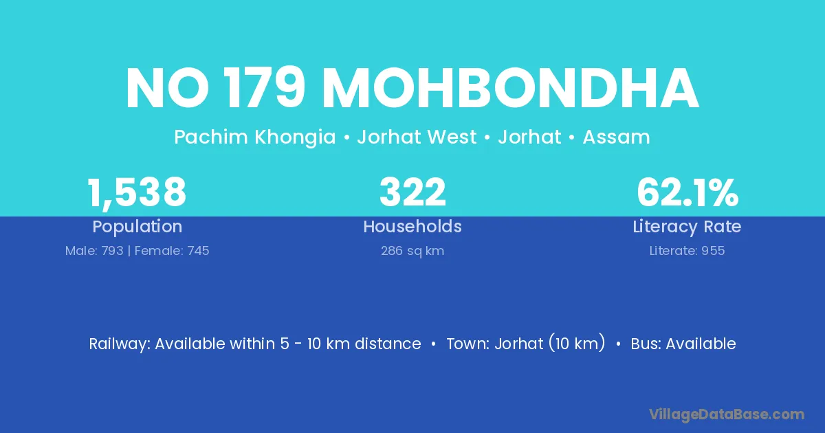 Jorhat (10 km) is the nearest town to No 179 Mohbondha village for major economic activities and is located approximately 10 km away.