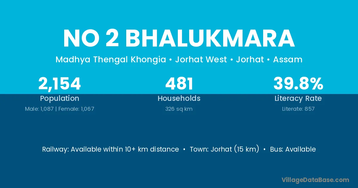 Jorhat (15 km) is the nearest town to No 2 Bhalukmara village for major economic activities and is located approximately 15 km away.