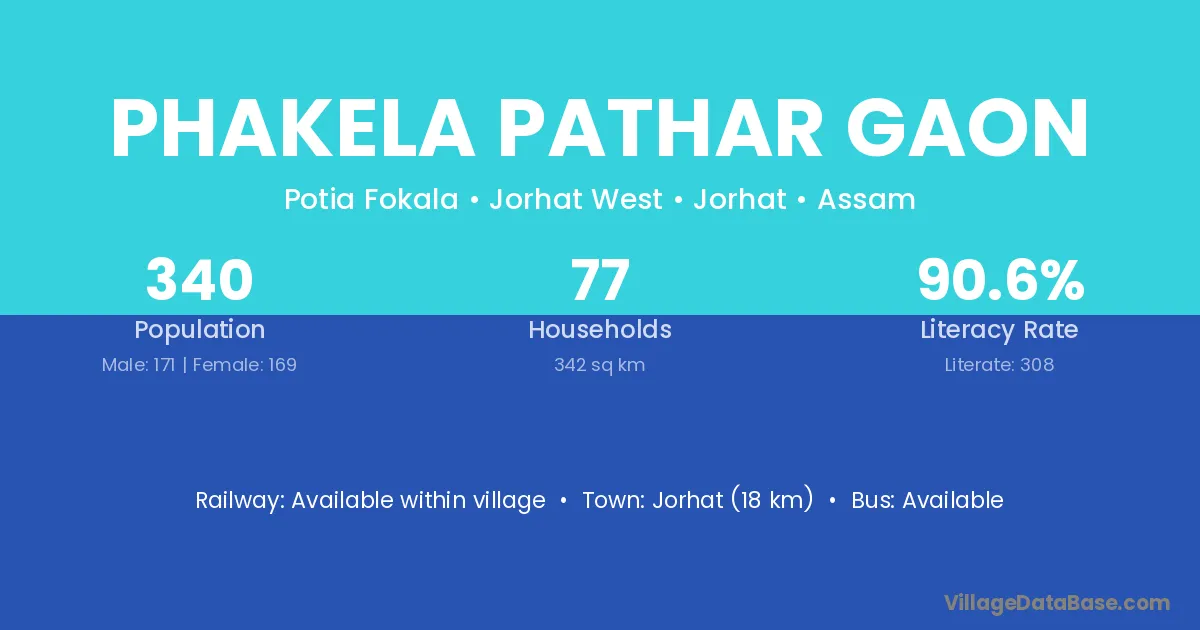 Jorhat (18 km) is the nearest town to Phakela Pathar Gaon village for major economic activities and is located approximately 18 km away.