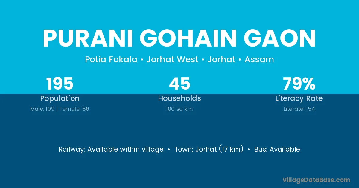 Purani Gohain Gaon village has a total population of 195 people, of which 109 are males and 86 are females.