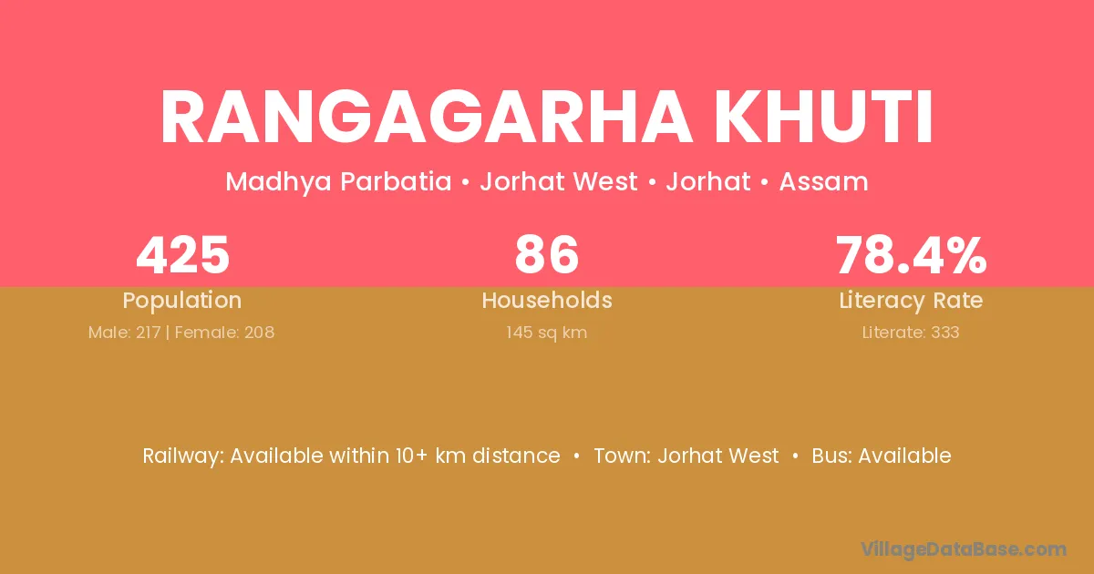 Rangagarha Khuti village has a total population of 425 people, of which 217 are males and 208 are females.