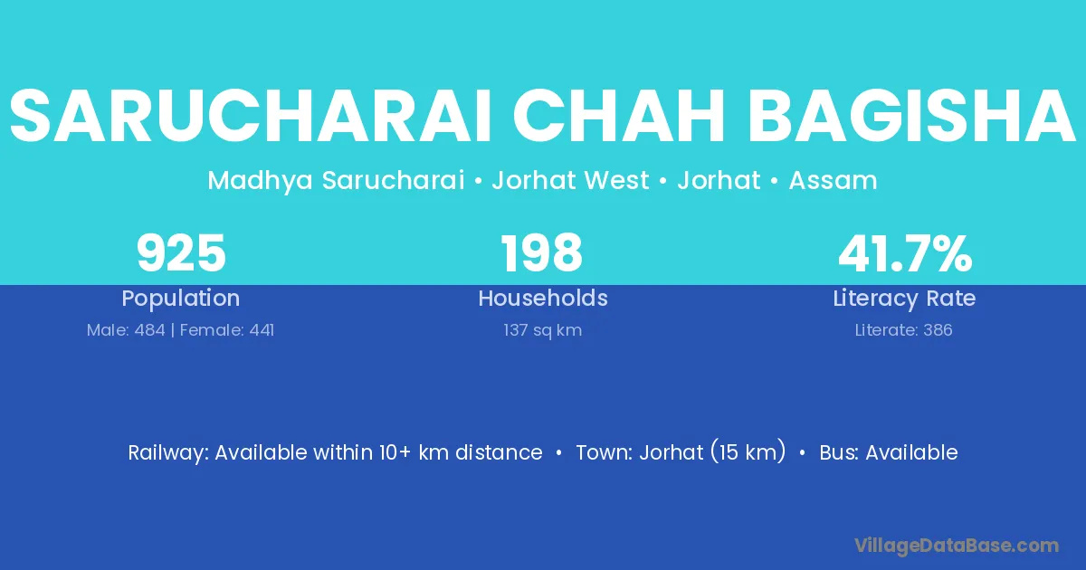 Jorhat (15 km) is the nearest town to Sarucharai Chah Bagisha village for major economic activities and is located approximately 15 km away.