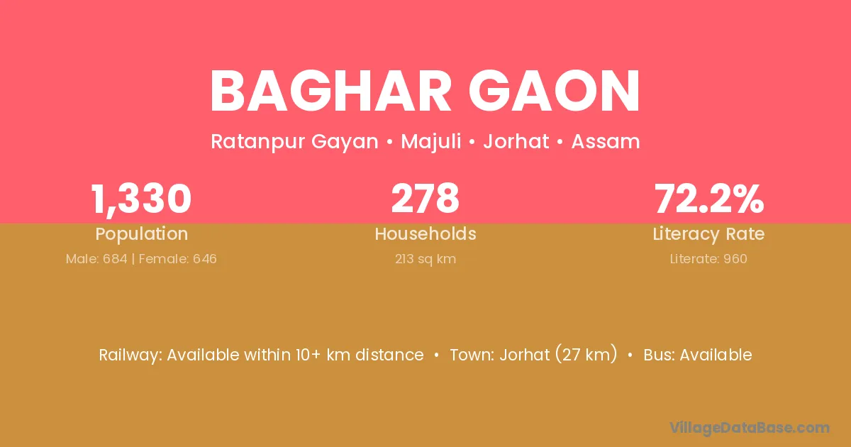 Jorhat (27 km) is the nearest town to Baghar Gaon village for major economic activities and is located approximately 27 km away.
