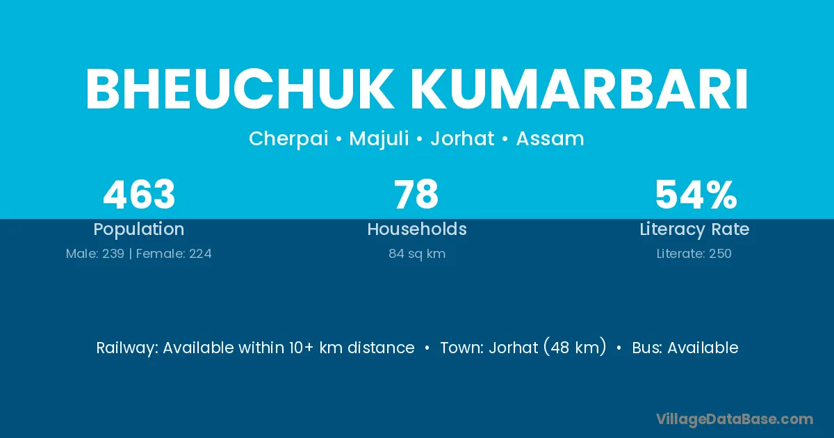 Jorhat (48 km) is the nearest town to Bheuchuk Kumarbari village for major economic activities and is located approximately 48 km away.