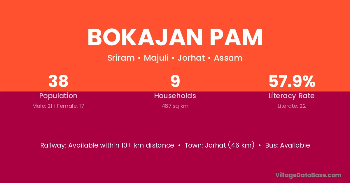 Bokajan Pam village has a total population of 38 people, of which 21 are males and 17 are females.