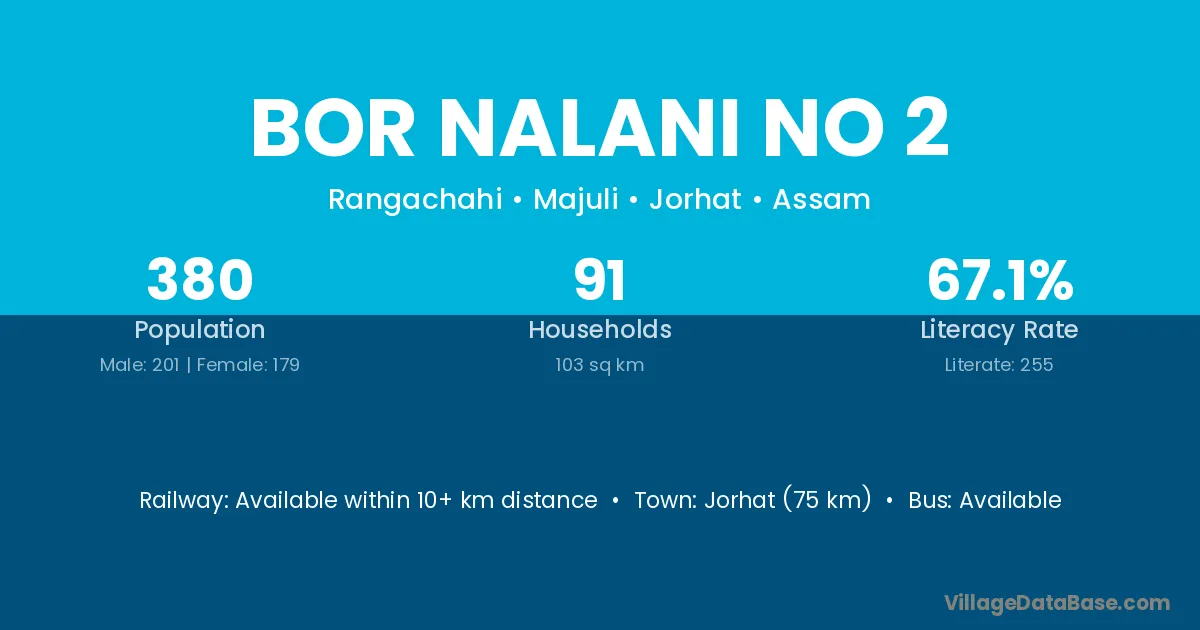 Jorhat (75 km) is the nearest town to Bor Nalani No 2 village for major economic activities and is located approximately 75 km away.