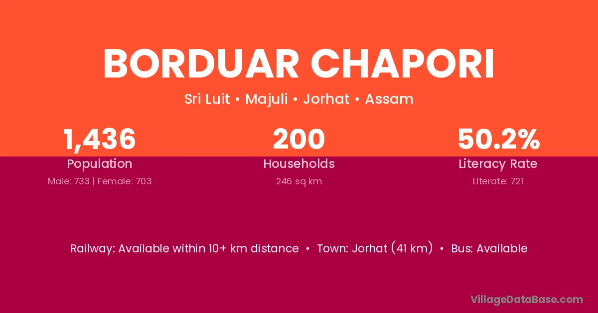 Jorhat (41 km) is the nearest town to Borduar Chapori village for major economic activities and is located approximately 41 km away.