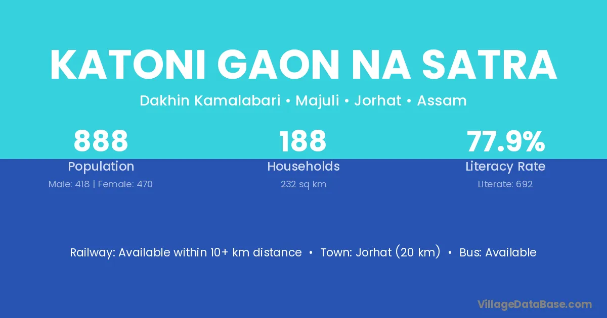 Katoni Gaon Na Satra village has a total population of 888 people, of which 418 are males and 470 are females.