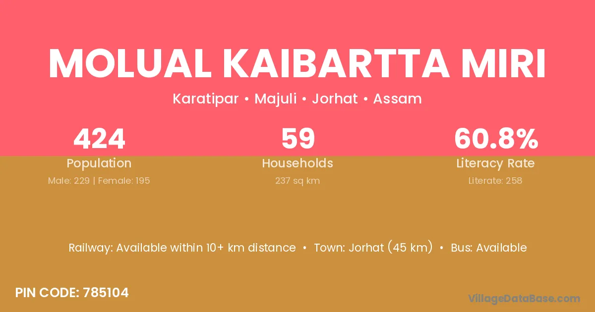 Molual Kaibartta Miri village has a total population of 424 people, of which 229 are males and 195 are females.