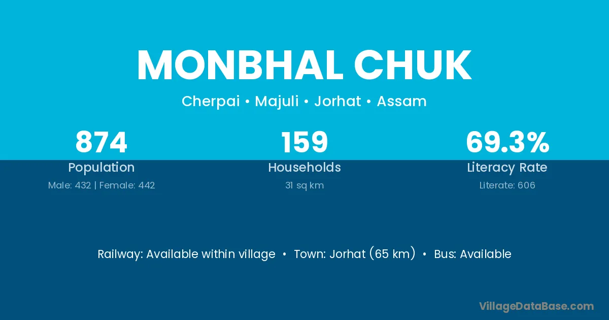 Jorhat (65 km) is the nearest town to Monbhal Chuk village for major economic activities and is located approximately 65 km away.