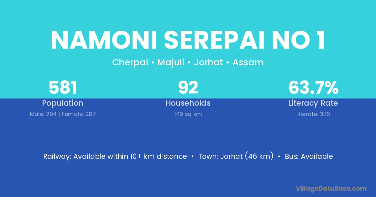Jorhat (46 km) is the nearest town to Namoni Serepai No 1 village for major economic activities and is located approximately 46 km away.