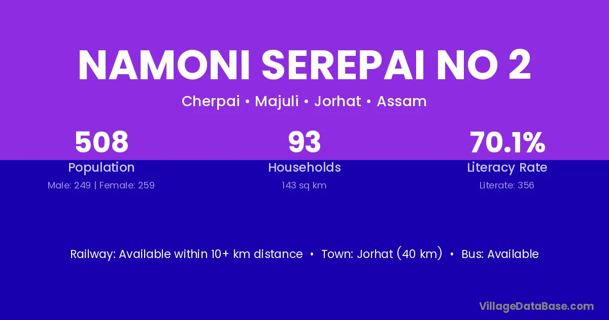 Jorhat (40 km) is the nearest town to Namoni Serepai No 2 village for major economic activities and is located approximately 40 km away.