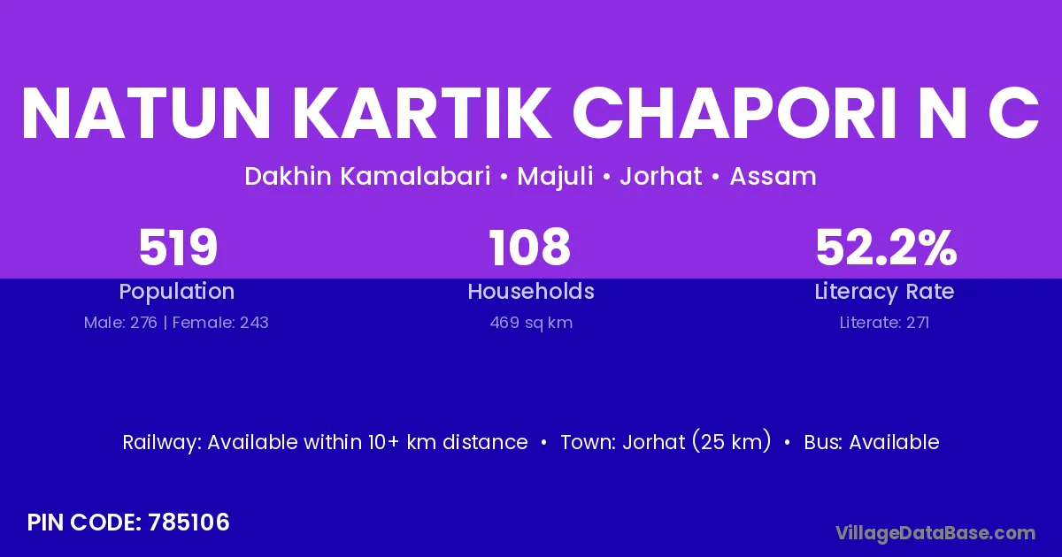 Jorhat (25 km) is the nearest town to Natun Kartik Chapori N C village for major economic activities and is located approximately 25 km away.