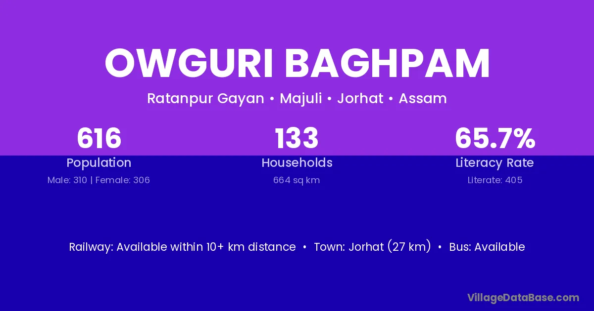 Jorhat (27 km) is the nearest town to Owguri Baghpam village for major economic activities and is located approximately 27 km away.