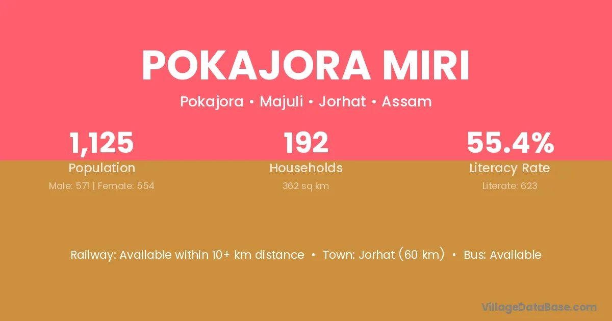 Jorhat (60 km) is the nearest town to Pokajora Miri village for major economic activities and is located approximately 60 km away.