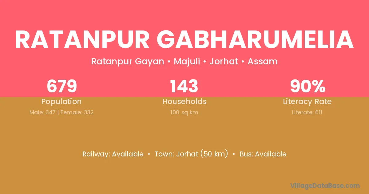 Jorhat (50 km) is the nearest town to Ratanpur Gabharumelia village for major economic activities and is located approximately 50 km away.