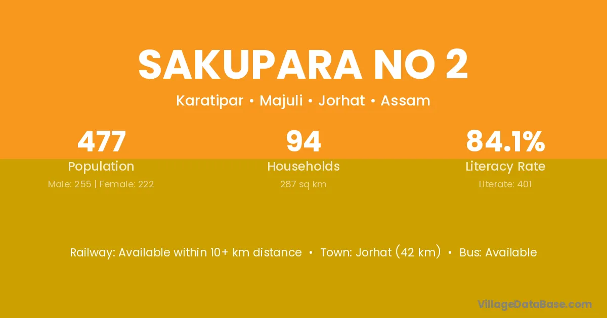 Jorhat (42 km) is the nearest town to Sakupara No 2 village for major economic activities and is located approximately 42 km away.