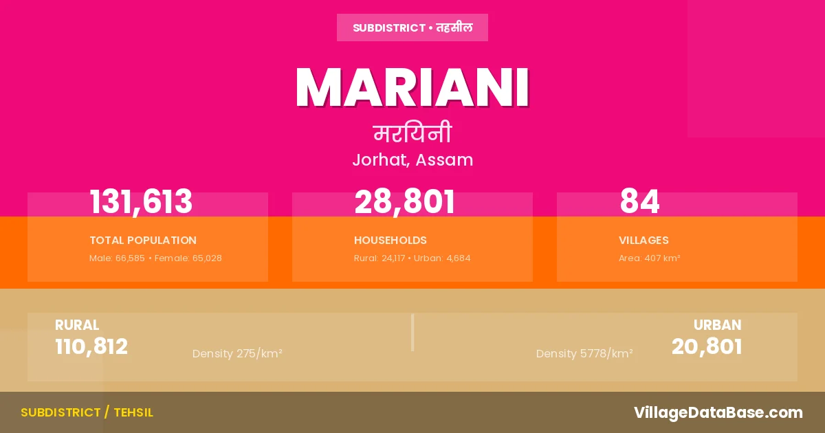 According to the 2011 census The total area of Mariani Subdivision is 407 km², with a population of 131613 people. The population density is 323 inhabitants per square kilometre, and there are approximately 28801 houses in the sub district.