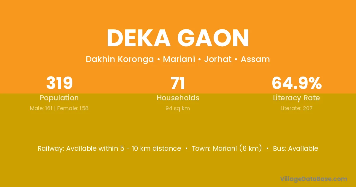 Deka Gaon village has a total population of 319 people, of which 161 are males and 158 are females.