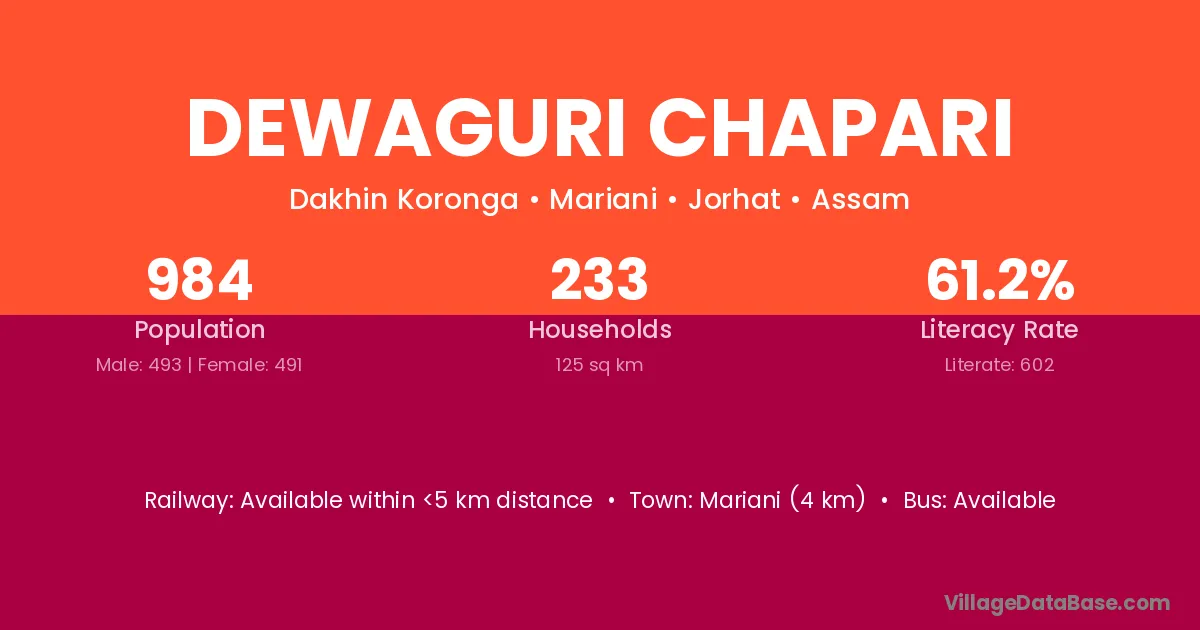 Dewaguri Chapari village has a total population of 984 people, of which 493 are males and 491 are females.