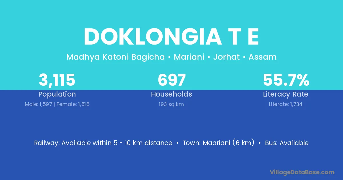 Maariani (6 km) is the nearest town to Doklongia T E village for major economic activities and is located approximately 6 km away.