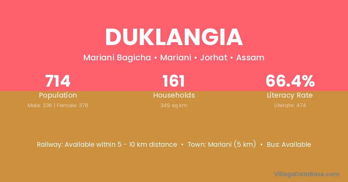 Mariani (5 km) is the nearest town to Duklangia village for major economic activities and is located approximately 5 km away.