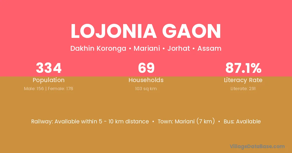 Mariani (7 km) is the nearest town to Lojonia Gaon village for major economic activities and is located approximately 7 km away.