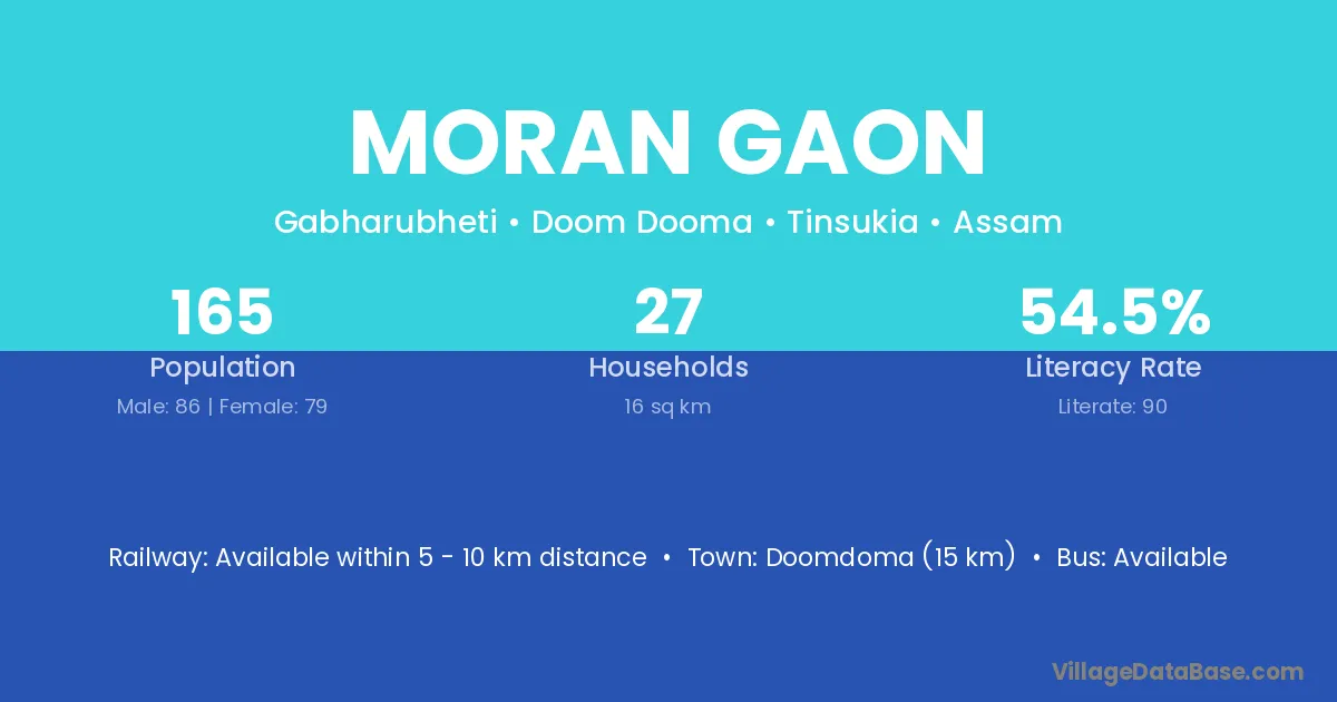 Moran Gaon village has a total population of 1,145 people, of which 584 are males and 561 are females.
