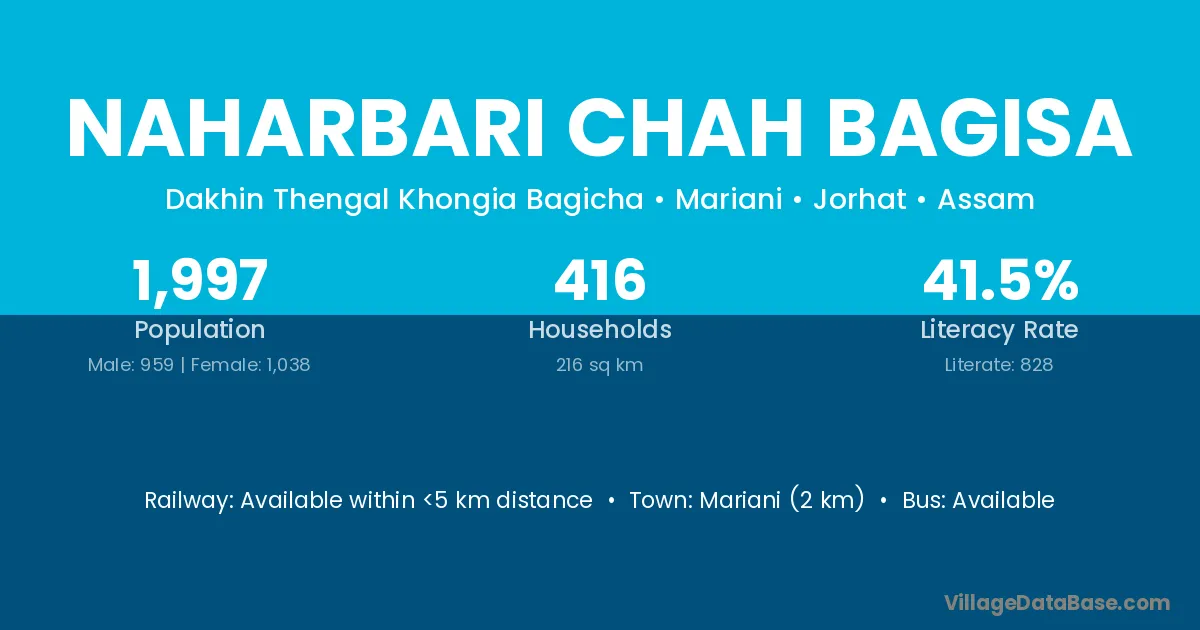 Mariani (2 km) is the nearest town to Naharbari Chah Bagisa village for major economic activities and is located approximately 2 km away.