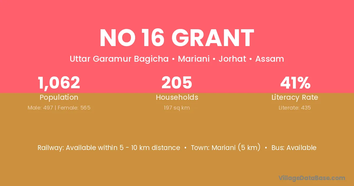 The literacy rate of No 16 Grant village is 40.96%. Male literacy stands at 53.92% and female literacy at 29.56%.