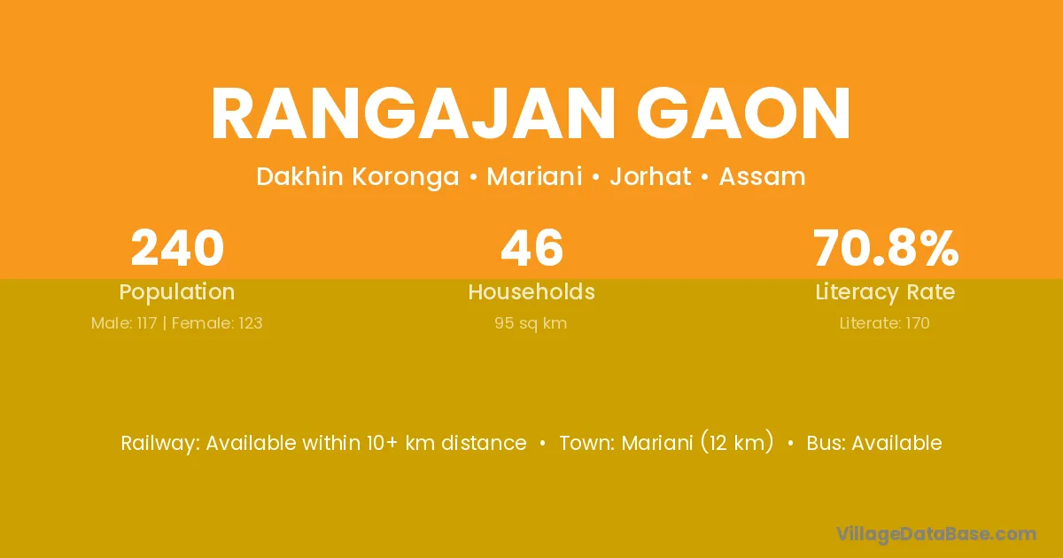 Rangajan Gaon village has a total population of 240 people, of which 117 are males and 123 are females.