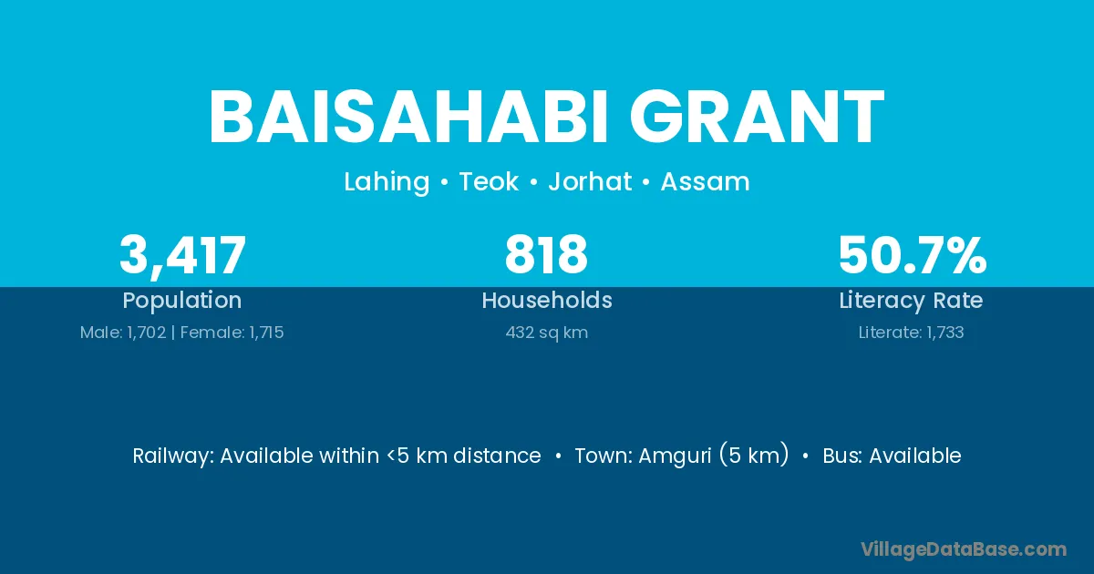 Amguri (5 km) is the nearest town to Baisahabi Grant village for major economic activities and is located approximately 5 km away.